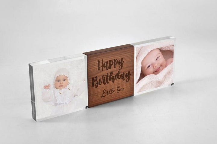 Celebrate your baby's first birthday, a christening, or any milestone with this elegant and modern Personalized Acrylic & Wood Photo Block. It's a unique and heartfelt alternative to traditional picture frames, blending the warmth of natural wood with the clarity of crystal-clear acrylic.