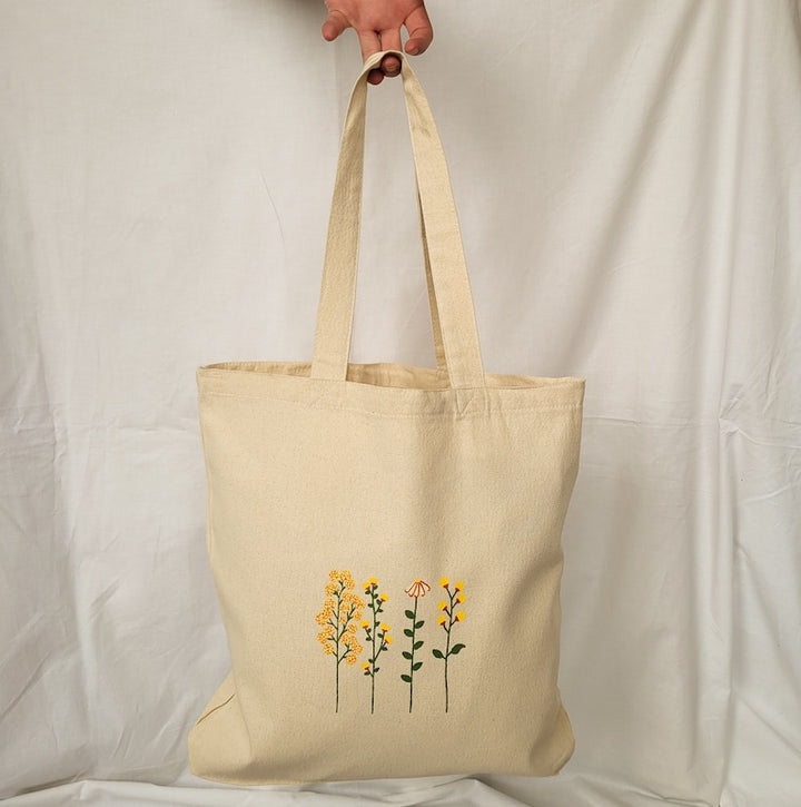 Carry a piece of the garden with you wherever you go! This beautiful tote bag is crafted from durable, natural-colored canvas and features a charming, unique hand-embroidered design of delicate wildflowers in earthy yellows, greens, and soft reds. It is the perfect blend of practical utility and artisanal charm.